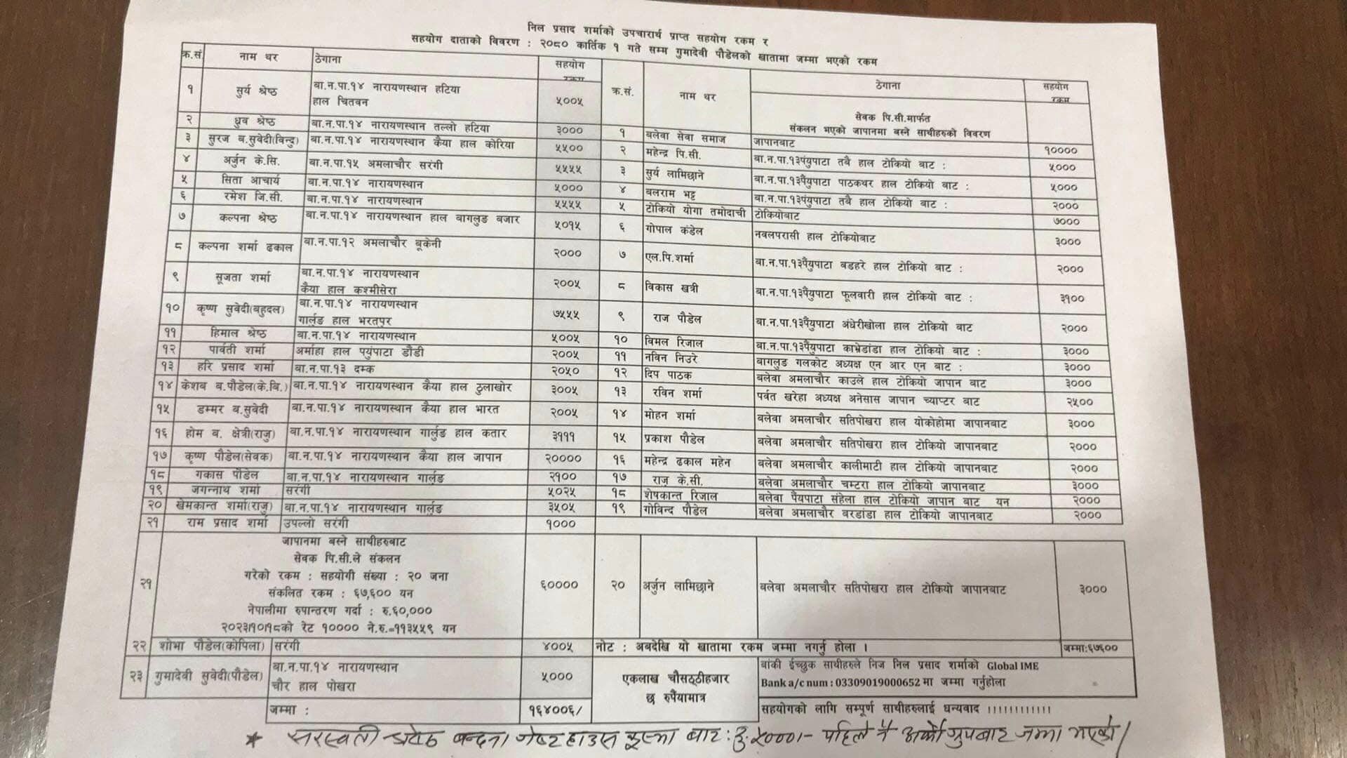 सहपाठी साथी सरस्वती श्रेष्ठले शुरुमै बिरामीको खातामा रु. ५,०००/- पठाई सहयोग गर्नु भएकोमा तपॅाईलाई पनि धन्यबाद । यो रकमलाई कुल रकममा जोडेको छु । नेपालमा आफ्नो खातामा रकम सॅकलन गराउनु हुने र साथीहरुलाई सम्पर्क गरि सहयोग गर्न अनुरोध गर्ने सहपाठी साथी गुमादेबी सुबेदी पौडेललाई पनि हार्दिक धन्यबाद व्यक्त गर्दछु ।